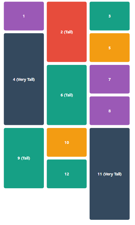 .item:nth-child(3n) {            background-color: #16a085;        }        .item:nth-child(5n) {            background-color: #f39c12;        }    </style>    <div class="container">        <div class="item">1</div>        <div class="item tall">2 (Tall)</div>        <div class="item">3</div>        <div class="item very-tall">4 (Very Tall)</div>        <div class="item">5</div>        <div class="item tall">6 (Tall)</div>        <div class="item">7</div>        <div class="item">8</div>        <div class="item tall">9 (Tall)</div>        <div class="item">10</div>        <div class="item very-tall">11 (Very Tall)</div>        <div class="item">12</div>    </div>
