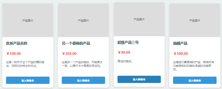 <div class="product-card">            <div class="product-image">产品图片</div>            <div class="product-info">                <h3 class="product-title">另一个很棒的产品</h3>                <p class="product-price">¥259.00</p>                <p class="product-description">这是另一个产品的描述,可能更长一些,以展示卡片高度的灵活性。</p>                <button class="add-to-cart-btn">加入购物车</button>            </div>        </div>