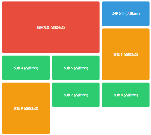 .magazine-layout > div {            padding: 20px;            border-radius: 8px;            color: white;            font-weight: bold;            font-size: 1.2rem;            display: flex;            align-items: center;            justify-content: center;        }    </style>    <div class="magazine-layout">        <div class="featured">特色文章 (占据4x2)</div>        <div class="secondary">次要文章 (占据2x1)</div>        <div class="tertiary tall">文章 3 (占据2x2)</div>        <div class="tertiary">文章 4 (占据2x1)</div>        <div class="tertiary">文章 5 (占据2x1)</div>        <div class="tertiary tall">文章 6 (占据2x2)</div>        <div class="tertiary">文章 7 (占据2x1)</div>        <div class="tertiary">文章 8 (占据2x1)</div>    </div>