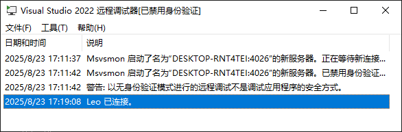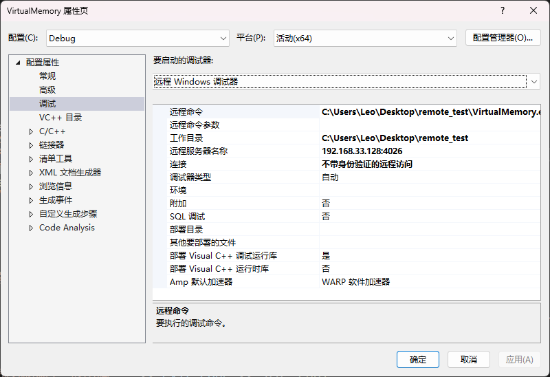 简介Visual Studio 支持远程调试。即本机调试远程计算机程序。  这在某些场景很实用,其中一个场景为输入框调试时,焦点会转移到VS上,导致无法按预期调试。那么采用远程调试的方式,就能避免这个问题了。 准备远程调试在测试机器(或虚拟机)上安装 **Visual Studio 远程调试工具 (Remote Tools for Visual Studio)**,版本必须和你开发机上的 VS 对应(比如 VS 2022 要下 VS 2022 Remote Tools)。 本地搜索  比如:  或者官网下载 Remote Tools 安装包,下载地址:微软官方 Remote Tools 在测试机(或者虚拟机)里打开   然后,在菜单栏-工具-选项,选择无身份验证(测试环境方便)或配置 Windows 身份验证。  部署调试版本程序在开发机上将 Debug 版本对应的可执行文件(包括 exe、dll、pdb 文件)拷贝到测试机(或者虚拟机),确保能够正常运行。 配置远程调试方法一右键单击项目并选择 属性。打开 调试 选项卡。 将“要启动的调试器”更改为“远程 Windows 调试器”。   配置相关属性: