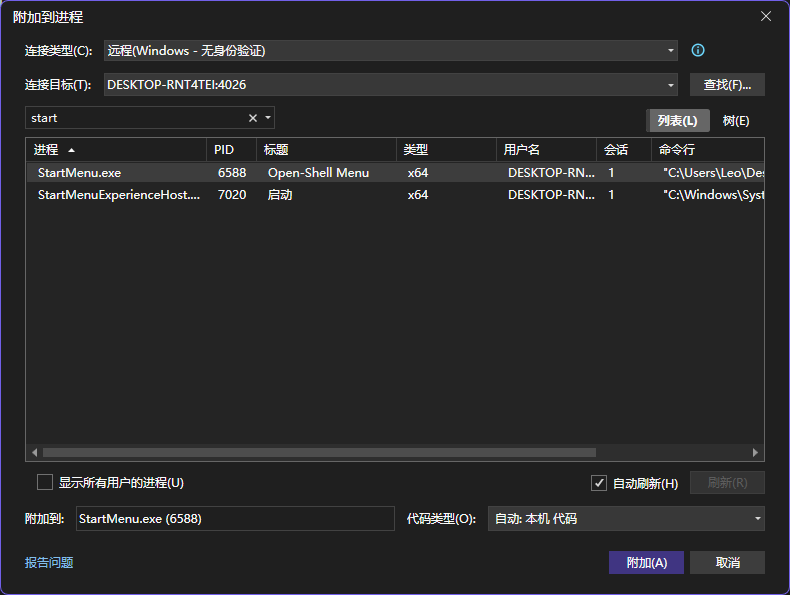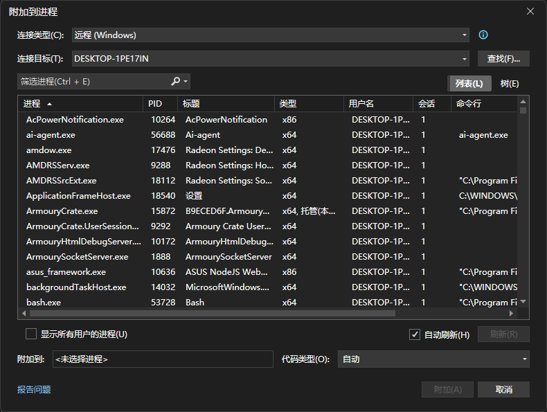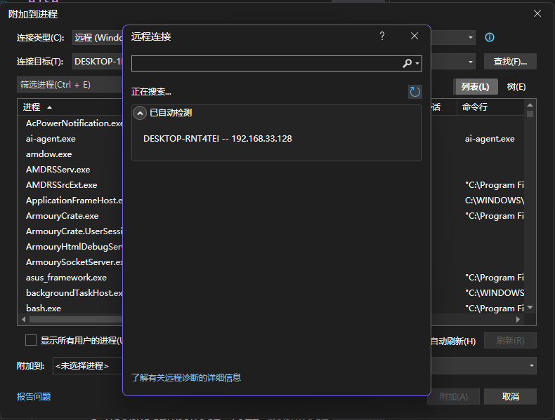 当你配置了部署目录,可在配置管理器里,将部署勾选上。  之后即可启动调试。将会自动连接并调试测试机(或虚拟机)的程序。 连接成功后,测试机(或虚拟机)  “ 方法二通过附加到进程的方式进行调试。 在开发机 VS ,菜单栏-调试-附加到进程,连接类型选“远程(Windows - 无身份验证)”,然后查找,顺利的话,将会显示对应的远程调试目标。   连接成功后,再选择对应进程,附加到该进程上:  之后即可开始调试。 “ “ 该文章在 2025/9/23 12:58:38 编辑过 | 关键字查询 相关文章 正在查询... |