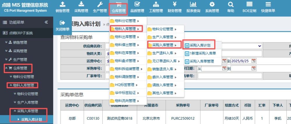 然后进入后,点击左侧或者上方的菜单内“仓库管理”,再点开“采购入库管理”,点击“采购入库计划”。