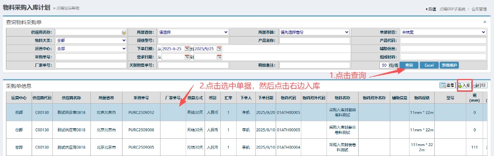 3.进入“采购入库计划”页面后,先点击查询,然后点击选中对应单据,在右边点击入库