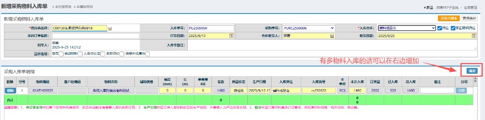 进入入库界面,先选择好入库仓库,然后确认好物料的入库数量、订货量和日期,点击提交待审