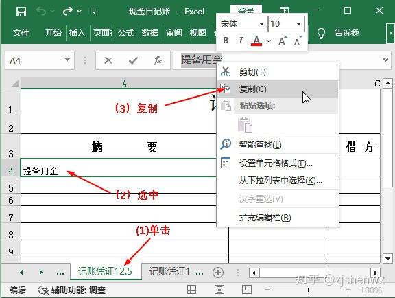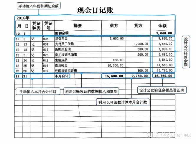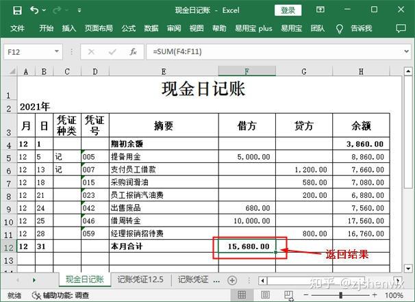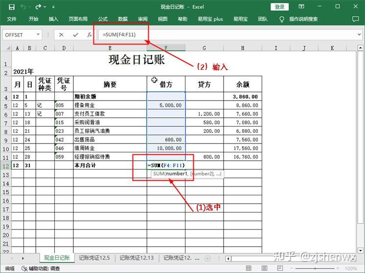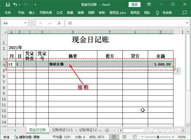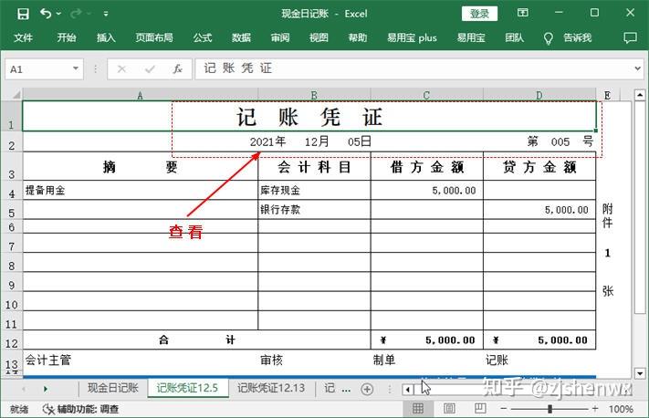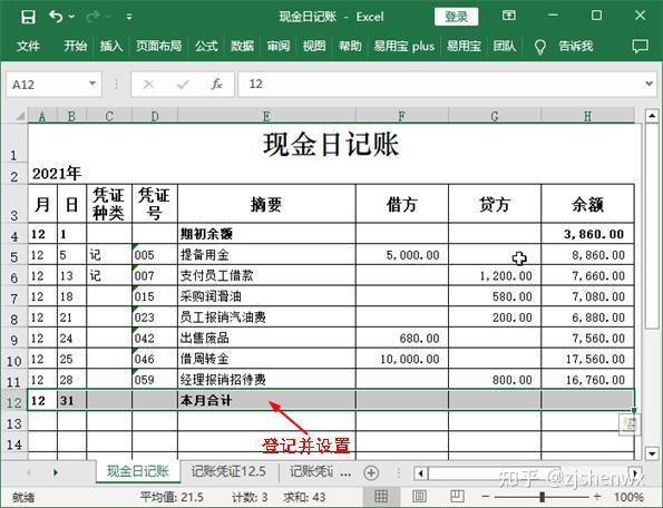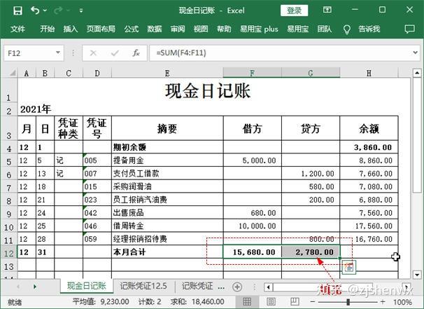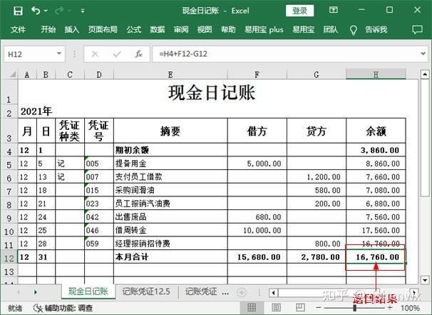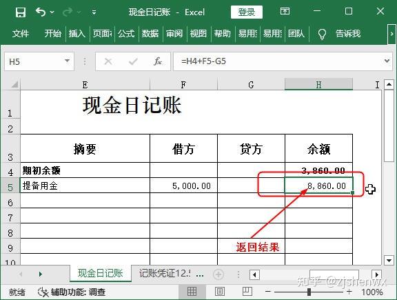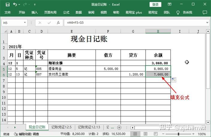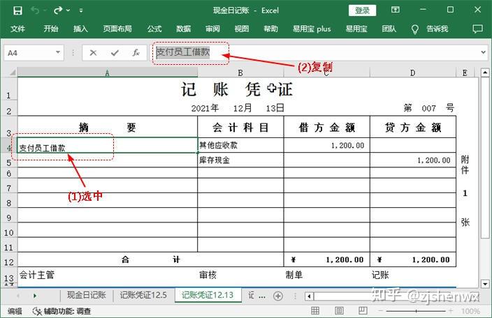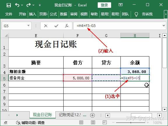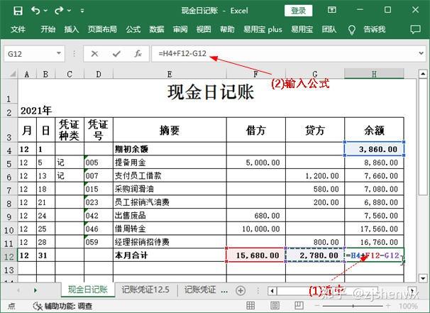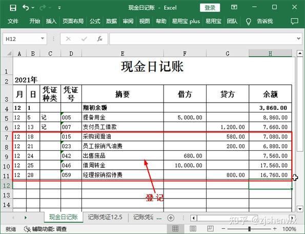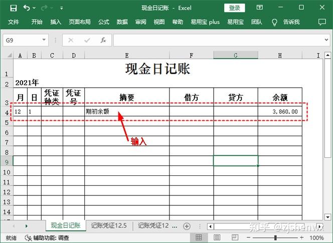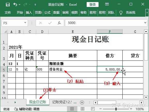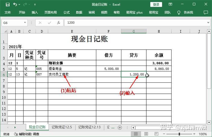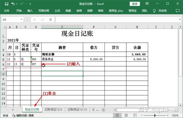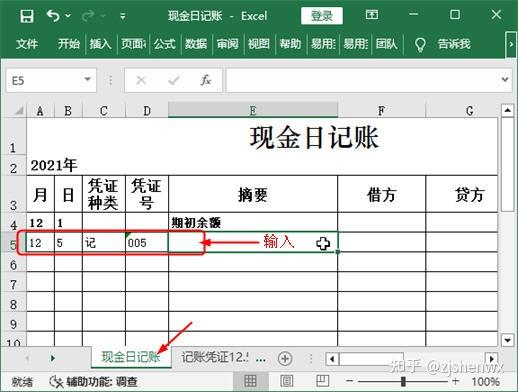 :现金日记账Excel模板的编制  现金日记账Excel模板的编制根据审核后的原始凭证编制记账凭证后,同样需要对记账凭证进行审核,只有通过审核后才能作为登记账簿的依据。现金日记账是企业必须设置的一类会计账簿,现金日记账由出纳人员根据同现金收付有关的记账凭证,按时间顺序逐日、逐笔进行登记,并根据“上日余额+本日收入一本日支出=本日余额”以及“期初余额+本期增加一本期减少=期末余額”的公式,逐日结出现金余额,然后将该余额与库存现金实存数核对,以检查每日现金收付是否有误。 一、 现金日记账对现金收支情况的反映企业一般以每一个月作为一个最小的会计期间,按月登记账簿。现金日记账即是通过将所有涉及现金收支的记账凭证中的数据登记到现金日记账中,通过借方、贷方和余额等栏目,清晰表现出每一笔与现金相关的经济业务的真实情况。现金日记账账页的一般格式如下图所示。  ●年月日:每笔现金业务的发生日期,即所依据的记账凭证中的日期。 ●凭证种类:如果是通用记账凭证,一般就录入“记”字,如果是专用记账凭证,则根据情况录入“收”“付”,或“现收”“现付”等字样。 ●凭证号:所依据的记账凭证中的凭证号。 ●摘要:所依据的记账凭证中的摘要。 ●借方、贷方:如果记账凭证中库存现金的发生额在借方,那么现金日记账上也登记到借方;如果记账凭证中库存现金的发生额在贷方,那么现金日记账上也登记到贷方。 ●余额:发生每笔现金业务后,通过计算得到的现金余额。其计算公式为:本日余额=上日余额+本日借方金额-本日贷方发生额 ●期初余额:即上一个会计期间结束后剩余的现金余额。 二、 登记现金日记账并计算余额通过记账凭证是很容易完成现金日记账的登记工作的,具体做法为:找到涉及“库存现金”科目的记账凭证,将其中需要的数据抄录到账簿中,然后计算出余额即可。但对于Excel而言,如果有记账凭证表格,那么这些数据都能复制或直接引用,余额也可以通过设计公式来自动计算,这样就大大提高了工作效率。假设现金日记账的期初余额为3860元,该月发生了7 笔与现金收支相关的经济业务,下面就利于Excel来完成现金日记账的登记工作。  1、输入年份和期初余额使用此模板登记现金日记账之前,需要手动输入该账簿所属会计期间的年份以及“库存现金”科目期初余额的数据。 【第1步】输入账簿年份 打开如下图示的“现金日记账”模板文件,选中A2单元格,在编辑栏中将“0000”修改为“2021”。  【第2步】输入期初余额 在第4行的单元格的相应位置输入期初余额栏目的有关数据,即表示12月1日时,“库存现金”科目的期初余额为3860元。  【第3步】加粗显示期初额 为了使期初余额的相关数据更加突出,这里可以选中A4:H4单元格区域,按【Ctrl+B】组合键将所选对象加粗显示。  2、利用记账凭证登记现金日记账通过输入和复制记账凭证中的相关数据,可以很快完成现金日记账的登记工作。对于现金日记账余额的输入,则可手动设计公式来实现自动计算。 【第1步】查看记账凭证数据 单击“记账凭证12.5”工作表标签,查看其中有关记账凭证的日期、编号等相关数据。  (注,如何查看记账凭证的类型:记账凭证的名称就可以反映它的类型。比如名称为“记账凭证”,说明它是通用记账凭证,类型可以用“记”表示;如果名称为“收款凭证”,则类型可以用“收”表示;如果名称为“现金收款凭证”,则类型可以用“现收”表示,以此类推。) 【第2步】登记现金日记账 (1)切换到“现金日记账”工作表;(2)在第5行中依次输入所查看的记账凭证中的日期、类型和编号等数据。输入凭证号之前,应首先将单元格的类型更改为“文本”型数据。  (注:如何取消单元格左上角的绿色标识?将单元格设置为文本型数据,然后在其中输入数字时,Excel会在单元格左上角显示绿色三角标识,提醒用户这是以文本的形式存放的数字。如果确认无误,且不需要该标识,可选中单元格,单击左侧出现的按钮,在弹出的下拉列表中选择“忽略错误”选项即可。) 【第3步】复制记账凭证摘要 (1)重新切换到“记账凭证12.5”工作表;(2)选中A4单元格;(3)在编辑栏中复制摘要内容,同时记住库存现金的金额方向和金额数据。  【第4步】在账簿中登记摘要和金额 (1)再次切换回“现金日记账”工作表;(2)选中E5单元格,在编辑栏中粘贴复制的摘要;(3)在F5单元格中输入“库存现金”科目的借方发生额。  【第5步】设计计算余额的公式 (1)选中H5单元格;(2)在编辑栏中输入“=H4+F5-G5”,表示库存现金的本日余额=上日余额+本日借方发生额-本日贷方金额。  【第6步】查看结果 按【Ctrl+Enter】组合键自动计算出余额的结果。  【第7步】查看记账凭证数据 单击“记账凭证12.13”工作表标签,查看第2张记账凭证的日期、编号等相关数据。  【第8步】登记现金日记账 (1)切换到“现金日记账”工作表;(2)在第6行中依次输入所查看的记账凭证的日期、类型和编号等数据。注意输入凭证号之前,同样需要将单元格类型更改为“文本”数据类型。  (注,事先调整单元格的数据类型:如果觉得每次输入凭证号之间都要设置数据类型太过麻烦,则可先将“凭证号”栏目下的所有空白单元格选中,将数据类型调整为“文本”型数据,后面直接输入凭证编号即可。) 【第9步】复制记账
