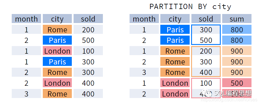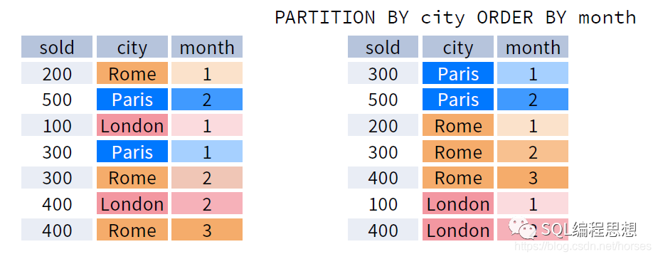 OVER 子句中的 ORDER BY 选项用于指定分区内的排序方式,与 ORDER BY 子句的作用类似;排序选项通常用于数据的排名分析。下图演示了按照 city 分区、按照 month 排序之后的数据: