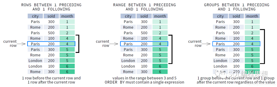 第一个窗口使用 ROWS 选项,包含了前后各 1 行以及当前行;第二个窗口使用 RANGE 选项,包含了当前行的数值减去 1(4-1=3)到当前行的数值加上 1(4+1=5)之间的所有数据;第三个窗口使用 GROUPS 选项,包含了前后各 1 组(ORDER BY 排序相同的数据为一组)和当前行。
