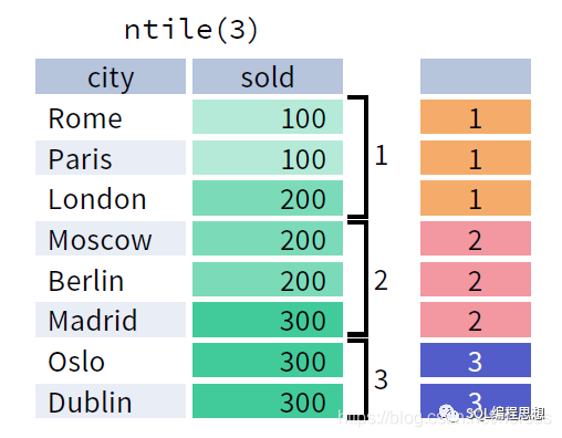 下图演示了 NTILE() 函数的效果: