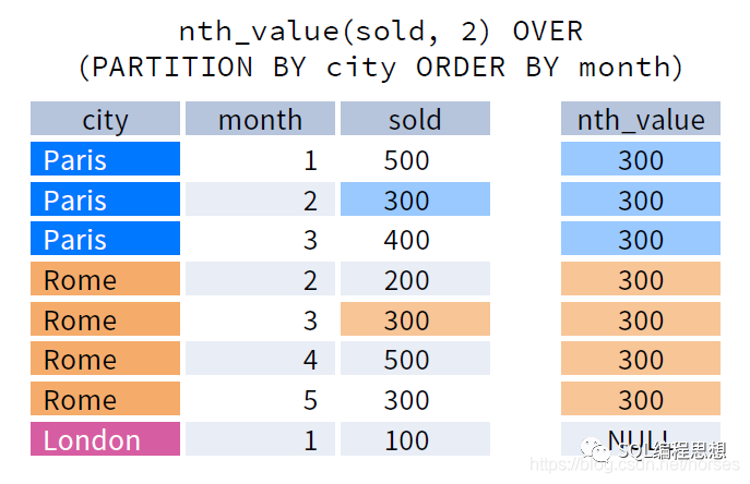 下图演示了 NTH_VALUE(expr, n) 函数的效果: