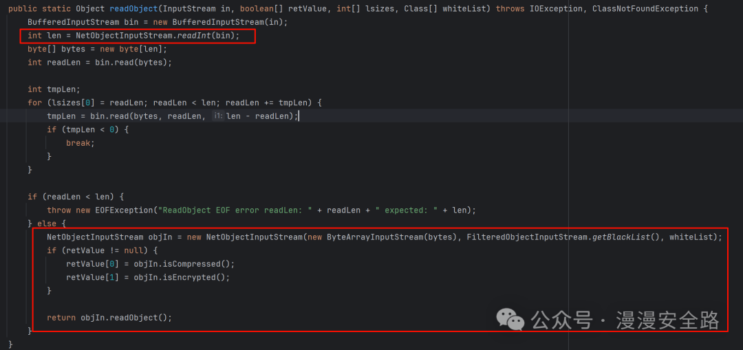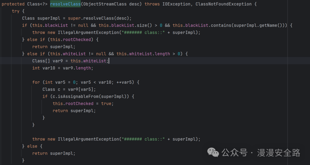 此处添加了黑白名单判断,且传入的rootChecked为false,whiteList为我们刚才传入的InvocationInfo.class所以这里使用白名单修复了之前的反序列化漏洞 然后我们回到readObject这里研究一下怎么生成这个序列化数据