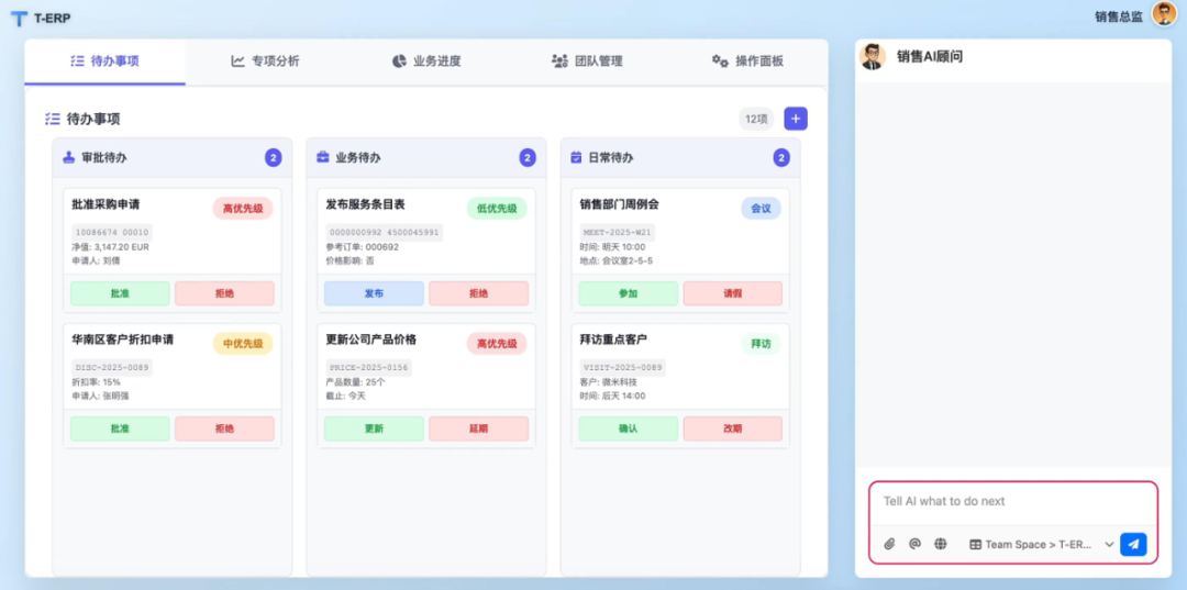 在云栖大会的企业服务展区,端点科技演示了一套区别于传统ERP的操作流程:员工登录系统后,无需在多模块菜单中寻找功能,右侧的AI顾问已自动推送当日待办——从销售目标异常分析到供应商协同提醒,甚至附带了风险判断与行动建议。点击建议后,系统可直接跳转至执行界面,无需人工二次操作。