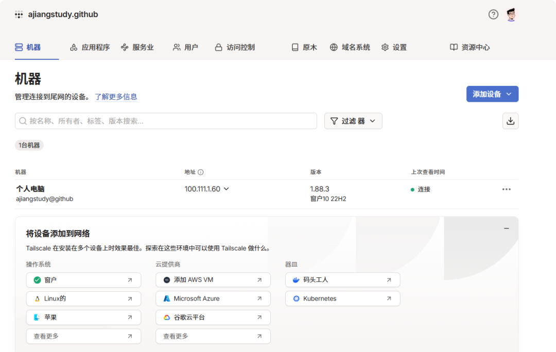 ✅ 第一步:下载安装支持Windows、macOS、Linux、iOS、Android、NAS(群晖、威联通、UNRAID) ✅ 第二步:注册账号用Google、Microsoft、GitHub账号一键登录。 ✅ 第三步:安装并登录每台设备都装Tailscale,登录同一个账号。