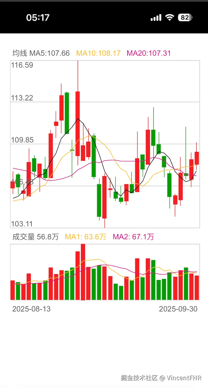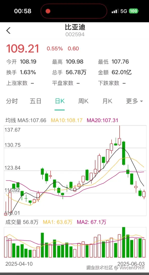 从上面的图可以看出, 需要画 5日均线、10日均线、20日均线, 成交量快线(10日)、成交量慢线(20日) 但是, 接口没有给出当日的均线值, 需要自己计算。