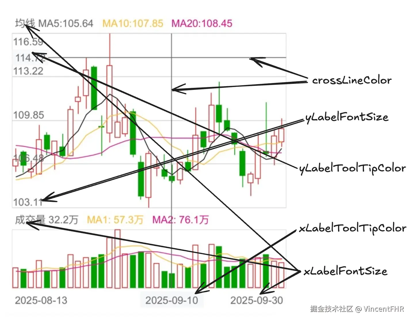 为了方便样式自定义, 我独立出一个默认的配置对象 defaultKlineConfig, 参数的含义如下图所示,其实下图这个风格的标注, 是通过 excalidraw 这个软件画的, 也是 canvas 做的开源软件, 可见 canvas 在前端可视化领域的重要性, 这个扯远了,打住。
