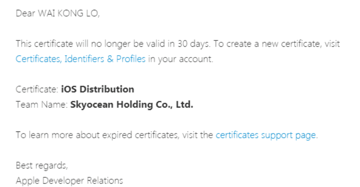 虽然distribution过期(或者被手动revoke)了,如果你的开发者账号是company(公司)类型或个人类型的,只要你的每年99$的开发者membership没有过期,就不会对已上架的app产生影响,只是你下次发布或者更新app就要重新生成一个distribution证书了。如果你的开发者账号是enterprise类型(企业级)的,证书过期或被revoke了之后,那么安装过该证书打包的app的用户将无法打开该app了,这就需要开发人员重新生成证书再打包一个app了。 该文章在 2025/10/14 11:25:07 编辑过 | 关键字查询 相关文章 正在查询... |