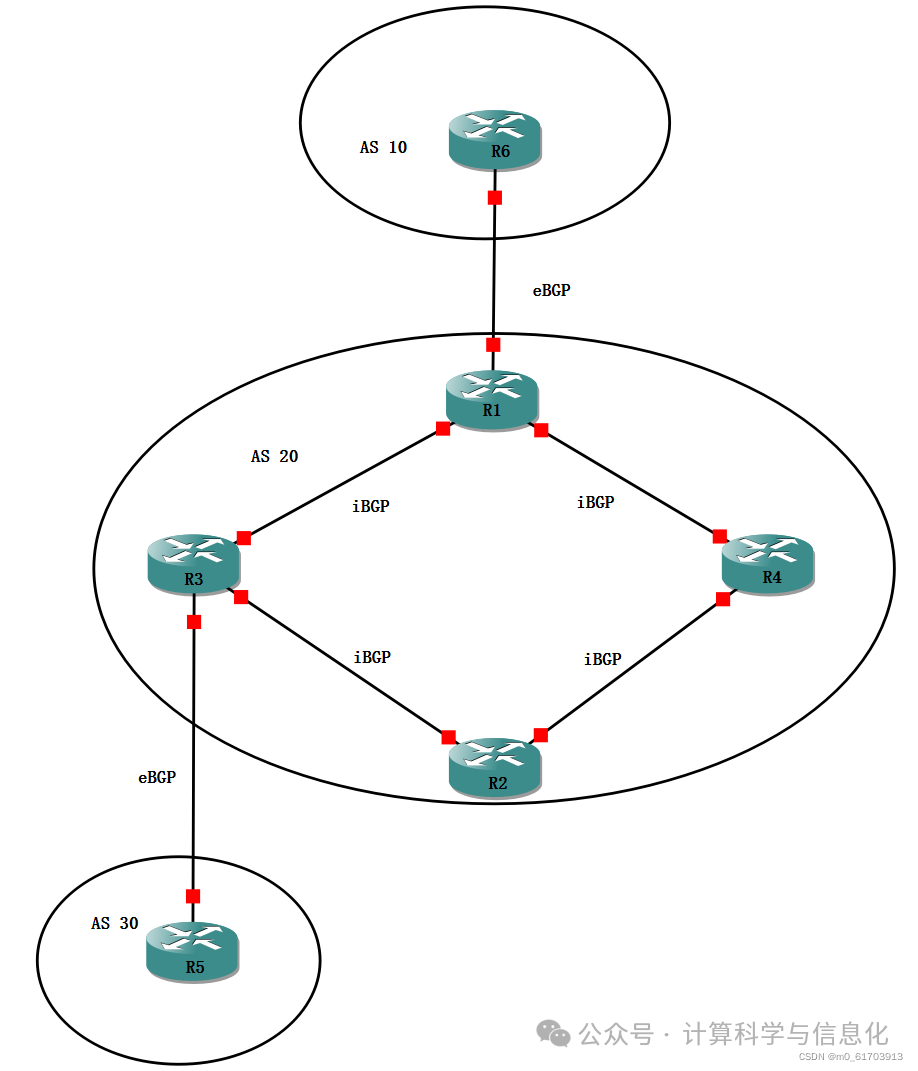 在上图中,当R1从eBGP邻居R6那里收到路由后,可以发给任何iBGP邻居,包括R3和R4。