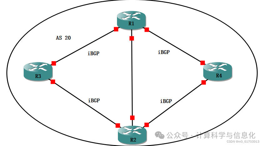 所以如此一来,在同一个AS中,要将路由全网传递,就需要在iBGP邻居之间配置全互联,最终AS 20内的邻居关系如下图: