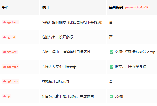 ⚠️ 注意:dragover 和 drop 事件中必须调用 e.preventDefault(),否则浏览器会执行默认行为(如打开链接或图片),导致拖拽失败。